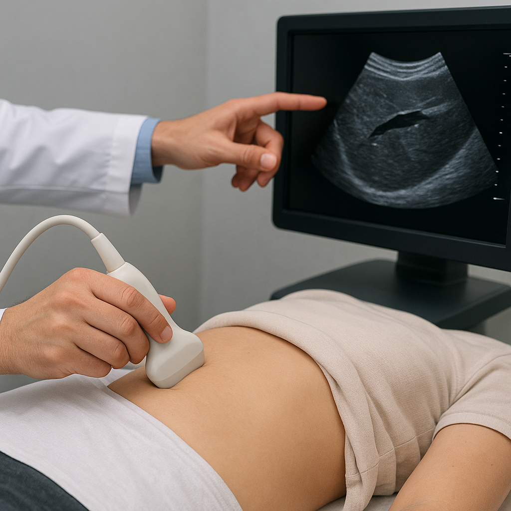 Badanie wykonuje się zwykle z użyciem głowicy konweksowej o częstotliwości 3–5 MHz. Pacjent leży na plecach, a następnie na boku prawym, co pozwala lepiej uwidocznić dolny biegun narządu. Lekarz ocenia: